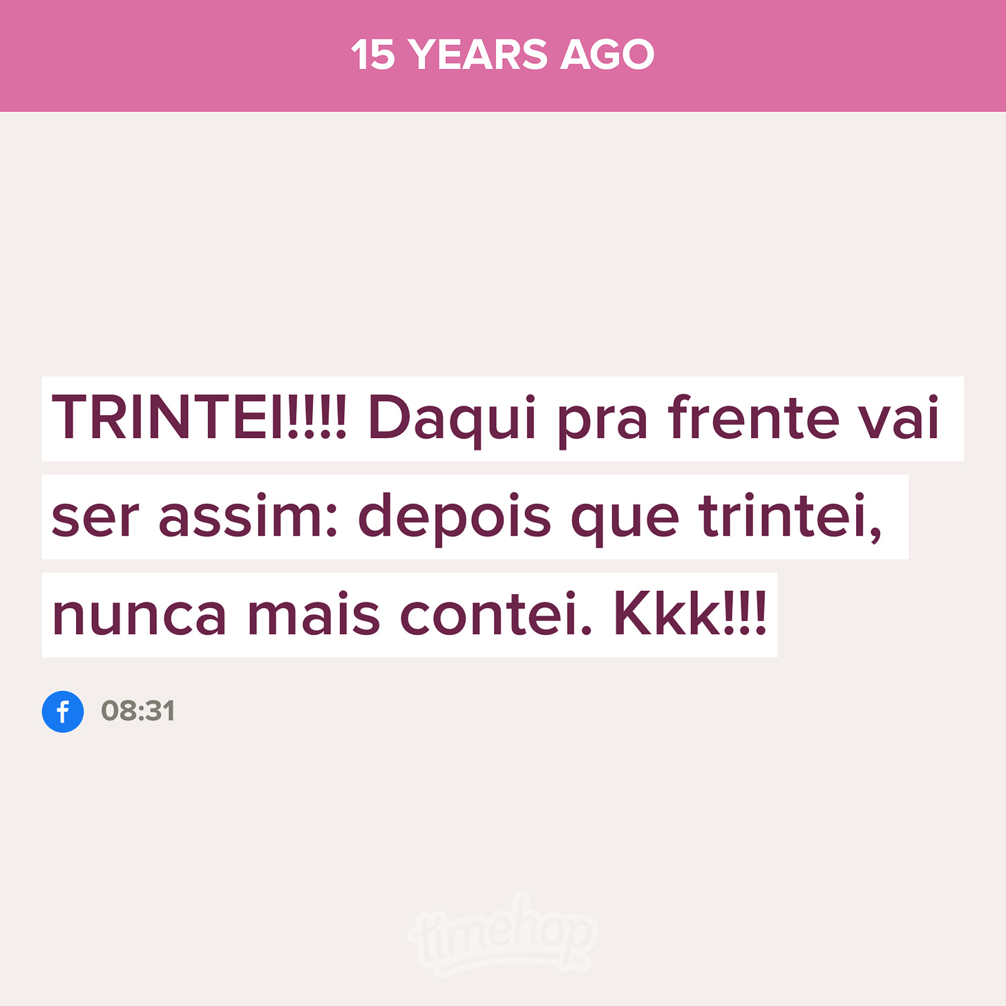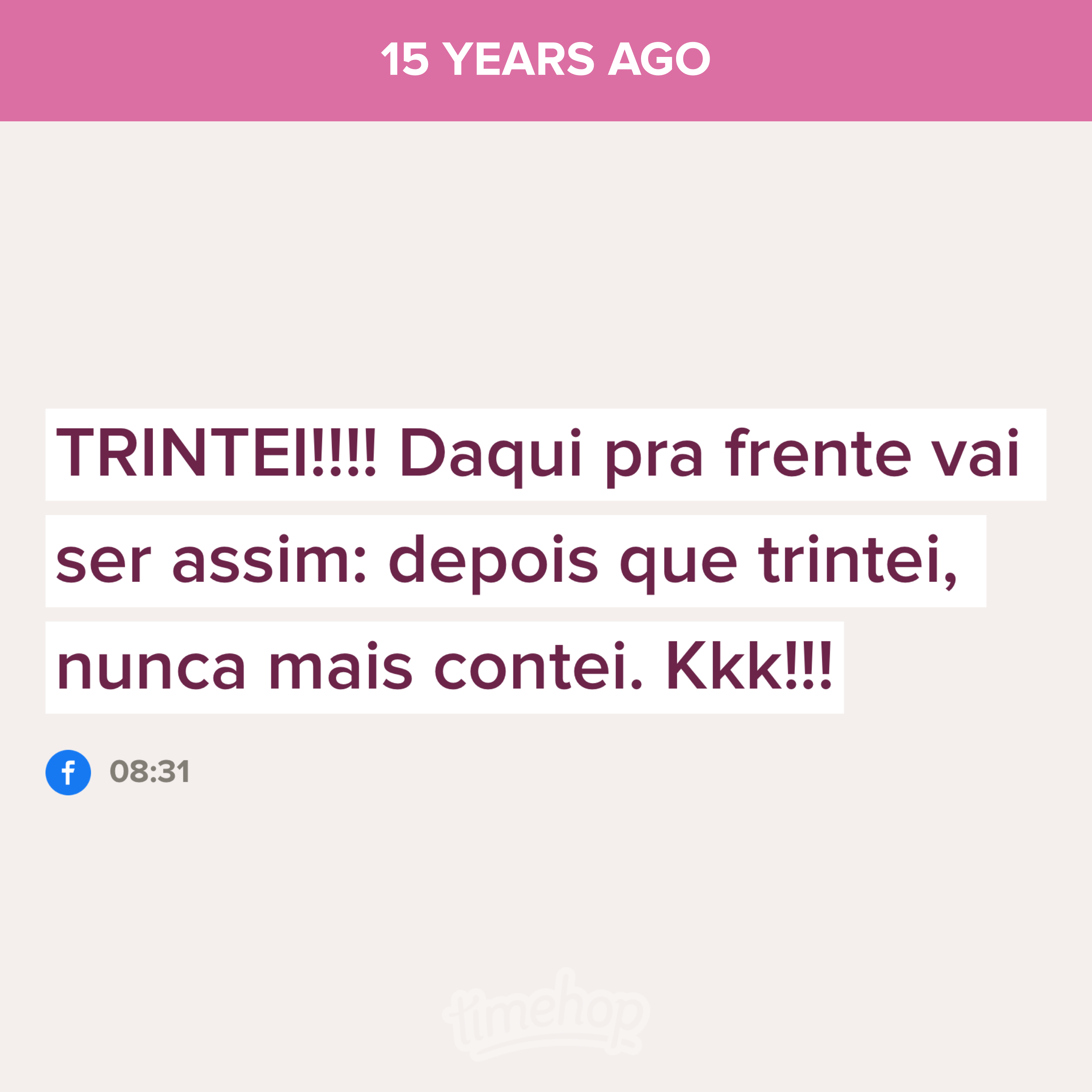 Tenho um app que se chama Timehop. Ele mostra o que você postou e que fotos ou vídeos você tirou nos anos passados. E ele vai longe, viu? Hoje vi no meu Timehop uma publicação no Facebook de 15 anos atrás: