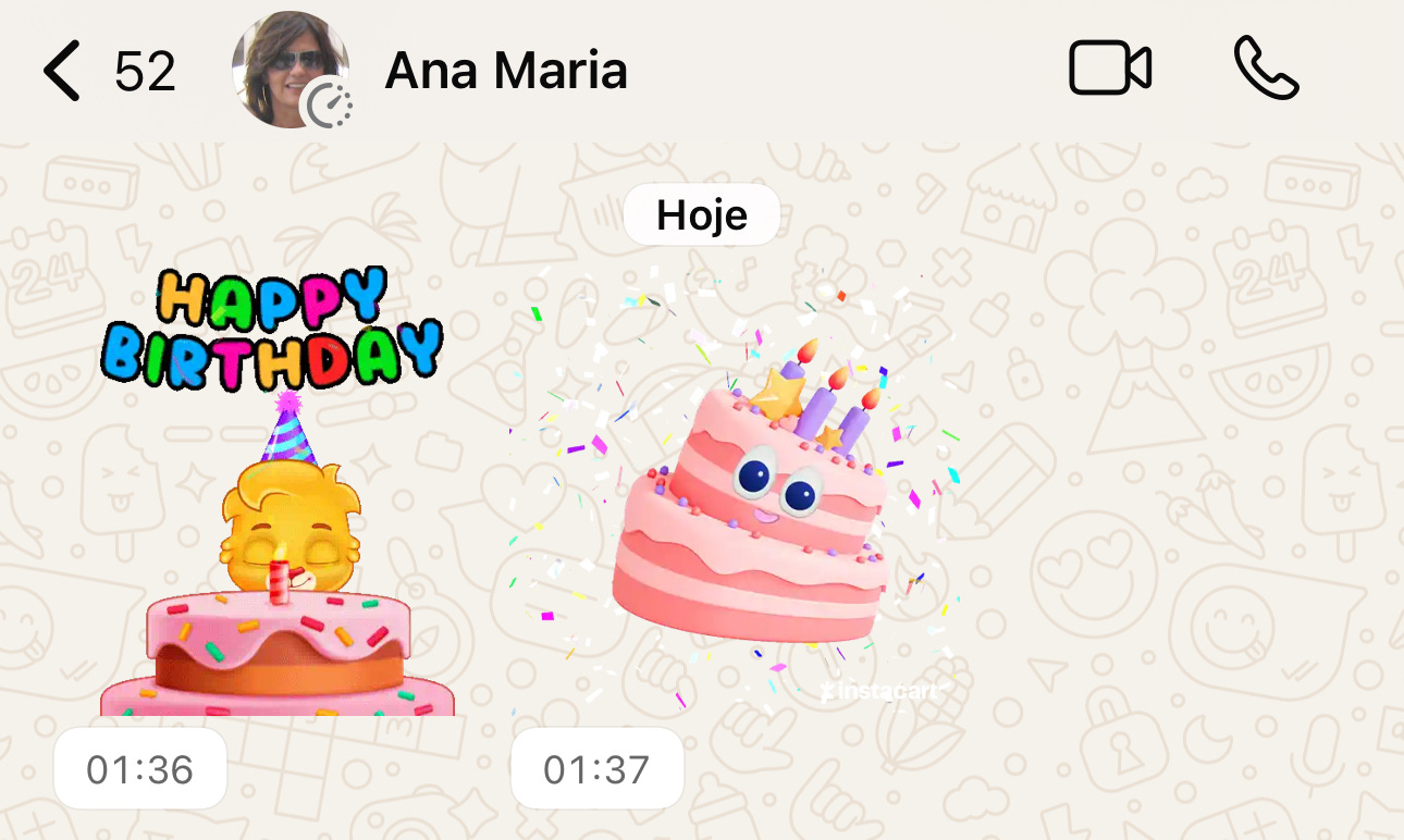 Minha mãe me mandou figurinhas de feliz aniversário no WhatsApp.