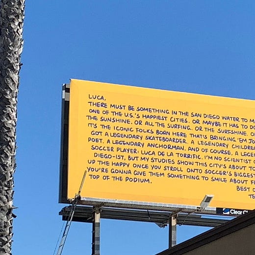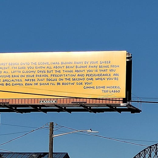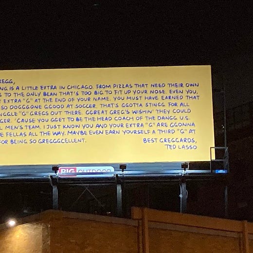 Já a campanha da Apple TV+ consiste em outdoors com palavras de incentivo de Ted Lasso (bem no estilo Ted Lasso de falar) a jogadores e técnicos da seleção americana em suas cidades natais. Veja algumas delas abaixo. Se já viu a série, vai amar!
