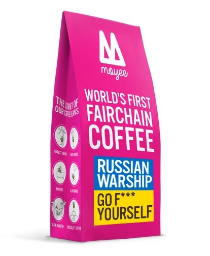 Quem foi infinitamente melhor que eu foi o café holandês Moyee, que lançou seu novo blend: Russian Warship: Go F*** Yourself (traduzindo: navio de guerra russo: f***-se).
